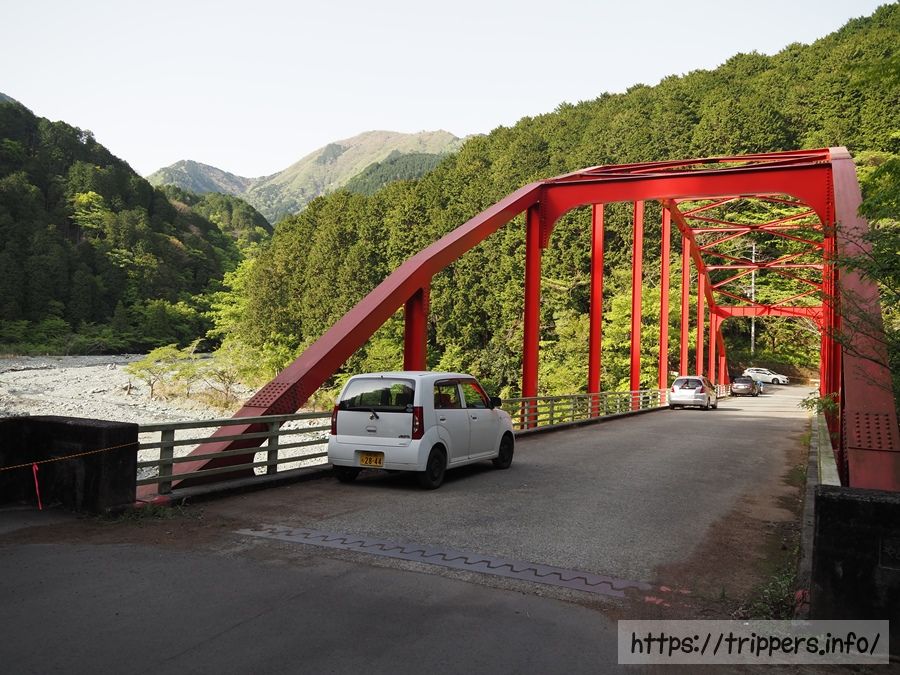 真っ赤なやどりき大橋に到着しました。駐車場はないようで、路肩に駐車して登山をするようです。バス停からここまで往復4.8kmあり、標準タイムは85分です。橋を渡らず、成長の森の方へ進みます。