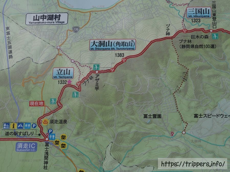今回の登山計画は、三国峠まで歩いたら車道を使って山中湖へ下山する予定です。三国峠までの標準タイムは5時間です。鉄砲木ノ頭(てっぽうぎのあたま)まで行こうか迷いますが、富士山の展望はないので悩みます。