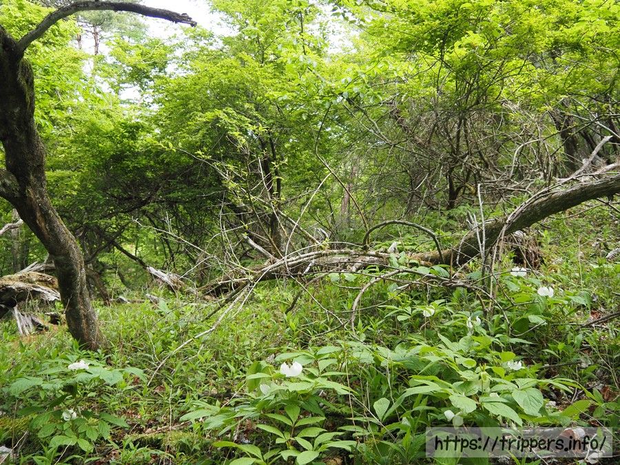 白い花で埋め尽くされたカーペットを歩きます。写真撮影に結構な時間を消費しており、時間的に大丈夫か心配して登山地図を確認すると標準タイムと比べて大幅な遅れはありませんでした。