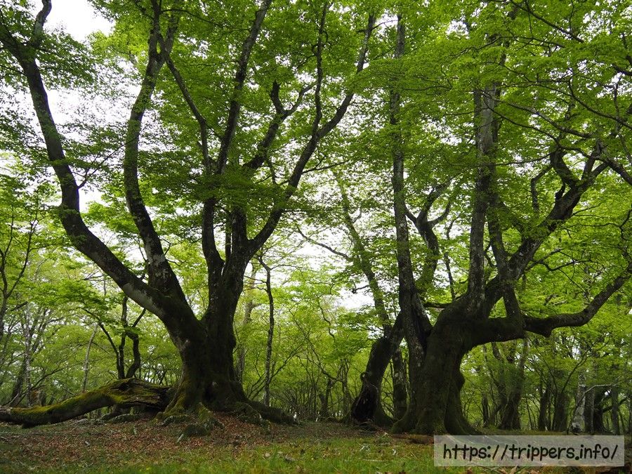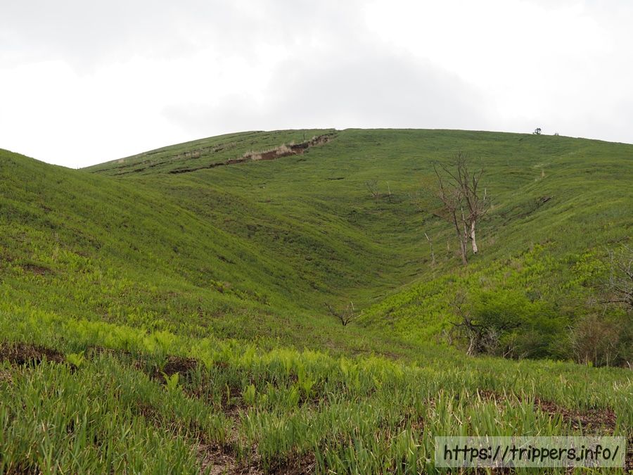 このまま鉄砲木ノ頭まで登っていけそうですね。伊豆にある大室山のようです。若い緑の発色は、時々降り注ぐ太陽光でより青さをより強調させます。