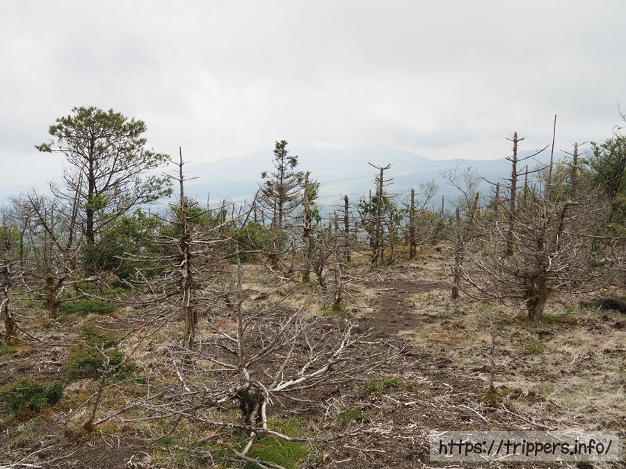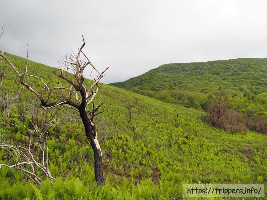 野焼きによって炭になった黒い樹皮と、剥げて白い幹のコントラストが趣きを与えました。奥には先程までいた三国山が見えます。