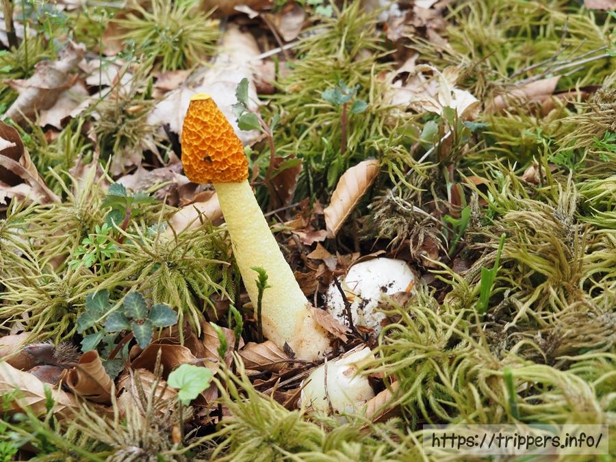 キイロスッポンタケです。すぐ隣には、白色の卵型をしている幼菌もありました。
