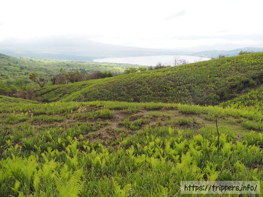 車道を歩きながらも野焼きしたコゴミの群生地へ寄り道します。山中湖までがまだまだ長いです。そこからバス停までもまだまだ長いのですが。