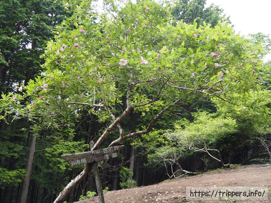明神峠から歩いてすぐの場所にある鉄塔横にあるサンショウバラの木です。富士箱根地区のみに分布する日本固有種です。分布域が限られるためか、絶滅危惧II類になっています。