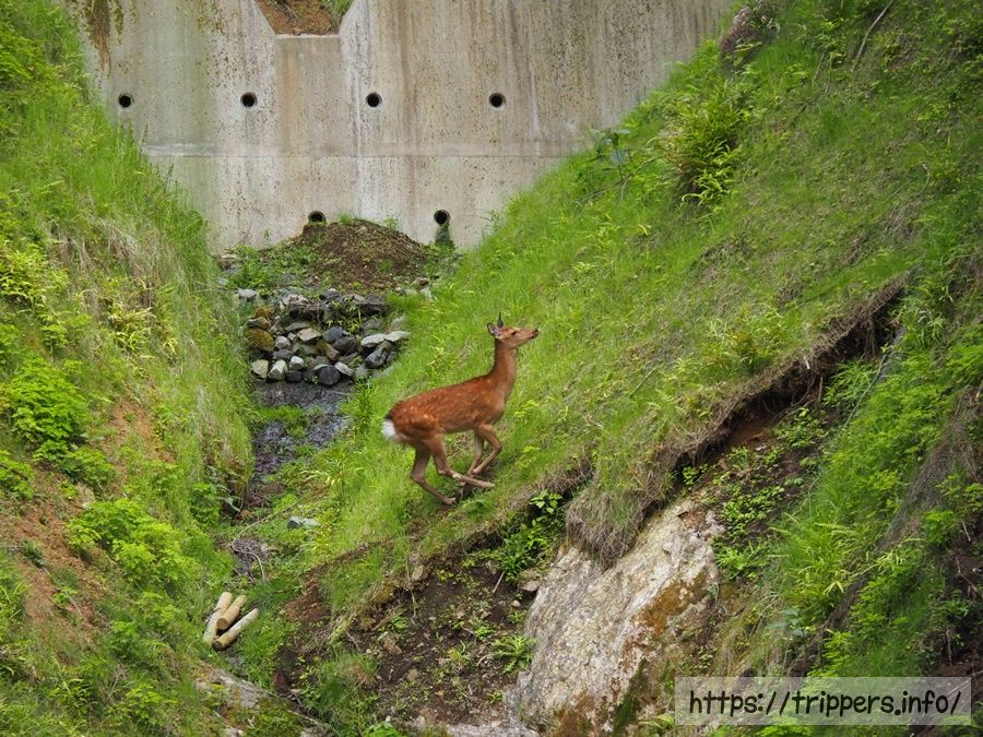 くねくねカーブする道を曲がった瞬間、目の前で食事をしている鹿に出くわしました。お互い存在に気が付かず、びっくりしましたが、ほんの数秒で鹿が遠い場所へ行ってしまいました。