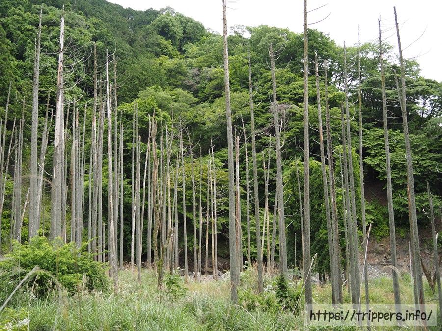 美瑛の青い池にある立ち枯れた木々を彷彿とさせる光景です。
