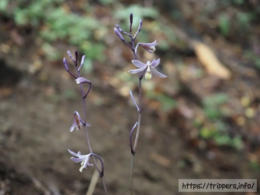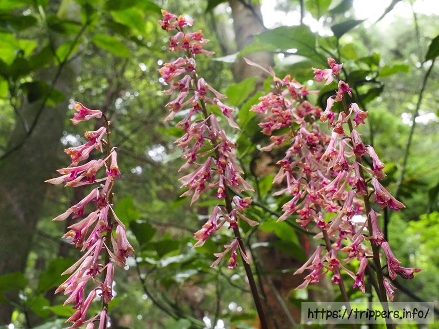 この時期の高尾山で一番人気の花は紫色をしたムヨウランでしょうか。同様に紫色をしたムヨウランの1種であるアワムヨウランには、茎にトゲがありますが、こちらはありません。特徴が異なるため、ムヨウランの突然変異なのかもしれません。