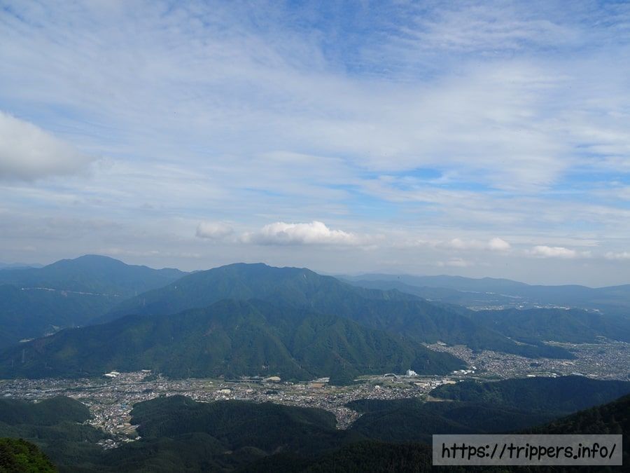 杓子山やクマガイソウの群生地がある倉見山の方角です。バスで山頂近くまで来たため、標高が高い場所に来た認識がなかったのですが、富士急行線の盆地地形が良く分かり、見渡せます。