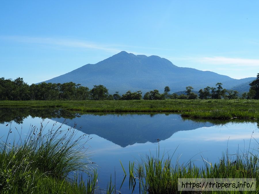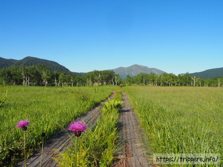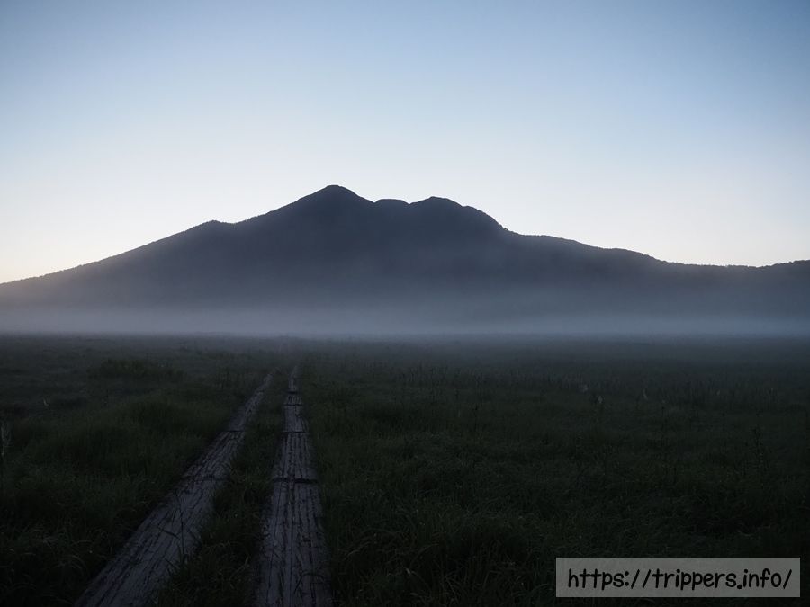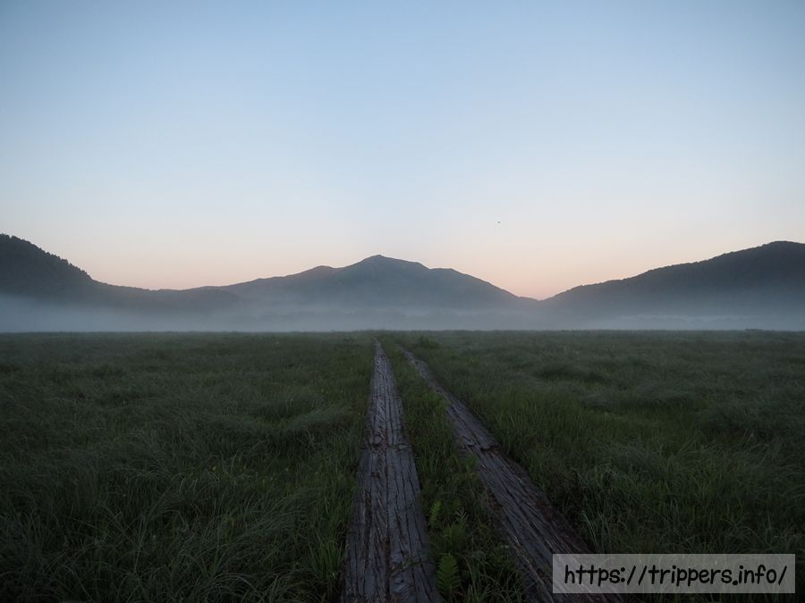 まずは早起きして、人のいない湿原を散歩します。燧ヶ岳と湿原の境目には朝霧が発生していました。