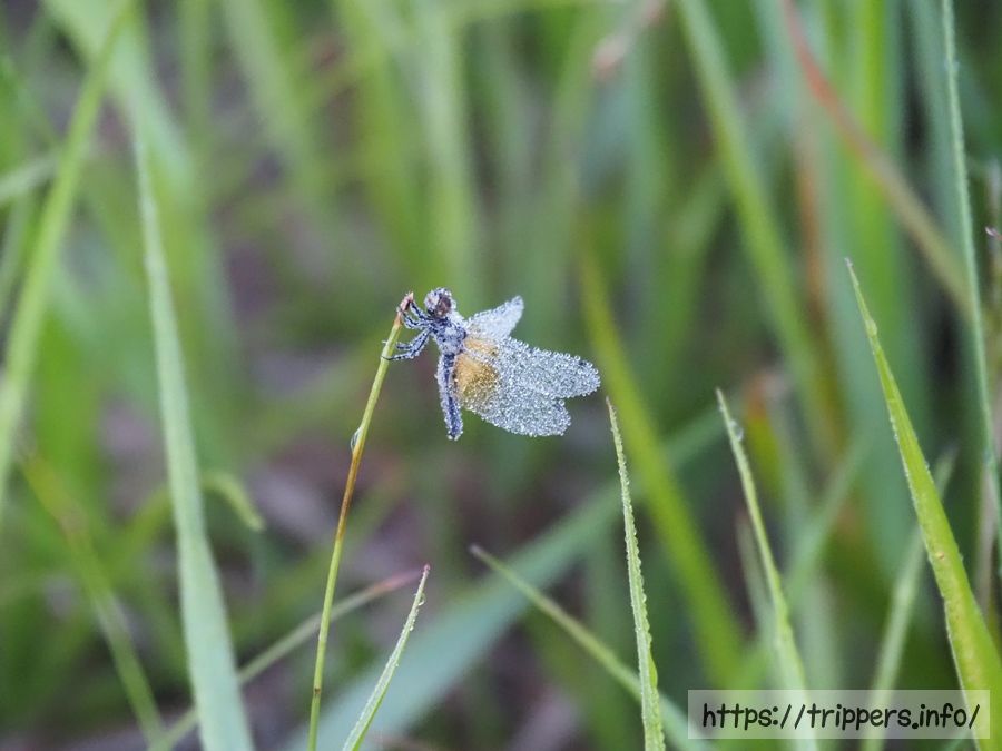 トンボには無数の水滴が全身に付着して、ピクリとも動いていませんでした。日光の光を浴びるまでじっとしているのかもしれません。昨日見た蛍も含め、尾瀬では生き物の命を感じさせられる場面が幾度かありました。