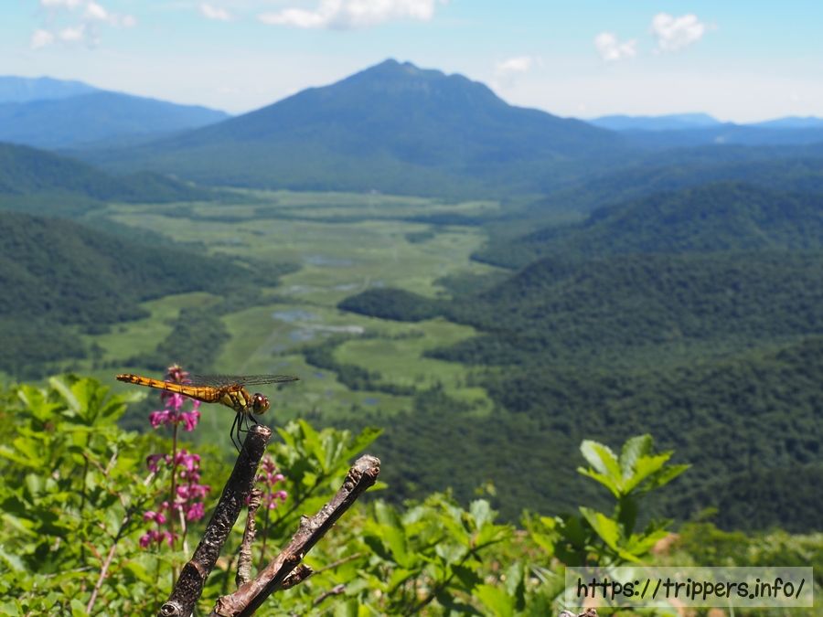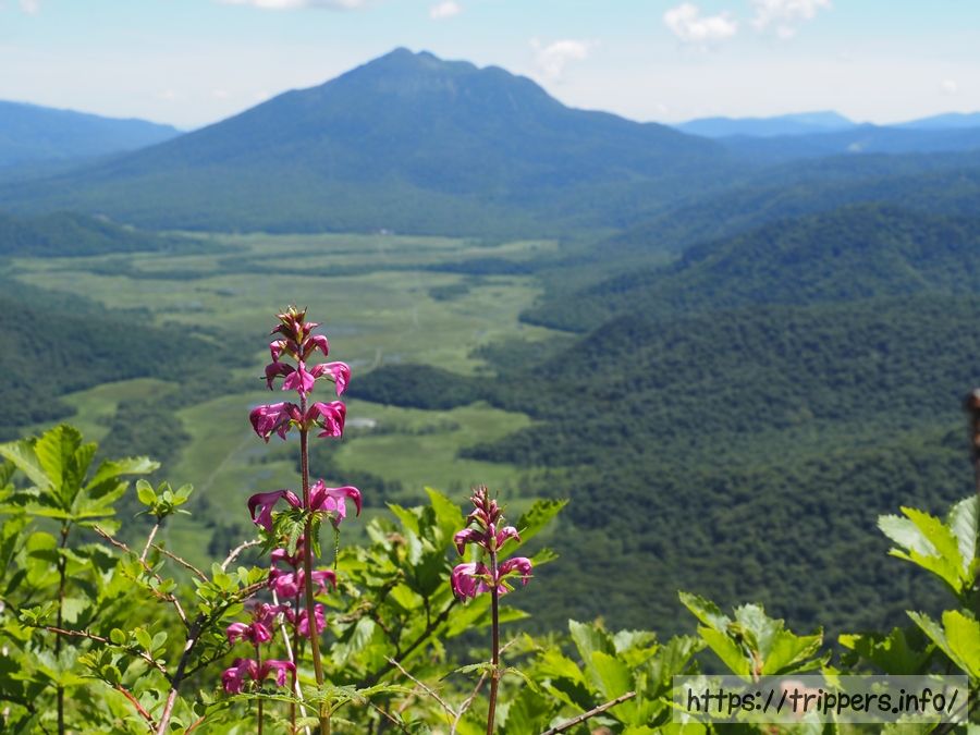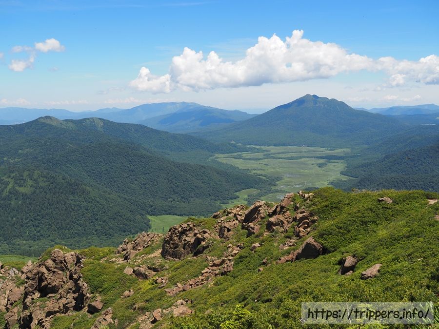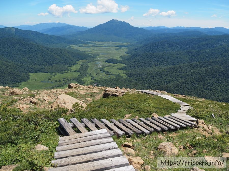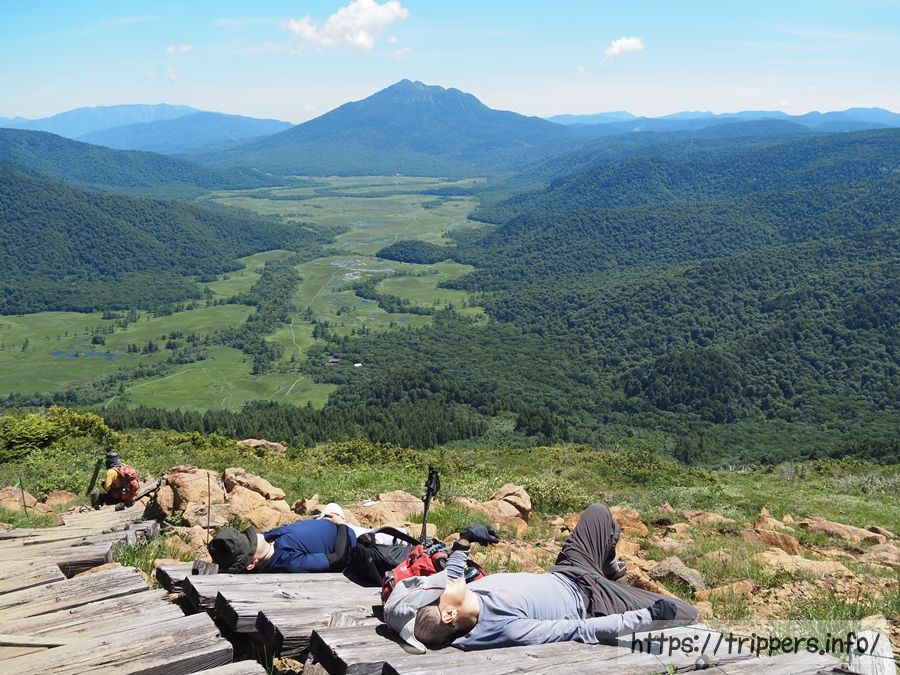 標高を上げていくと、昨日踏破した燧ヶ岳と尾瀬ヶ原が見えてきました。燧ヶ岳の山頂から見るよりも、池塘が分かりやすいです。