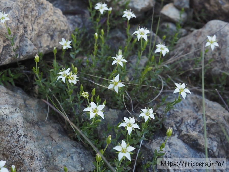 絶滅危惧Ⅱ類のカトウハコベがいました。実は、近くで2人の登山者が地面にうずくまっていて、何やら貴重な植物の話をしていました。地獄耳のダウジングセンサーが最高潮に反応していたので、話に混ぜて頂いたら、そこにこの植物が咲いていました。
