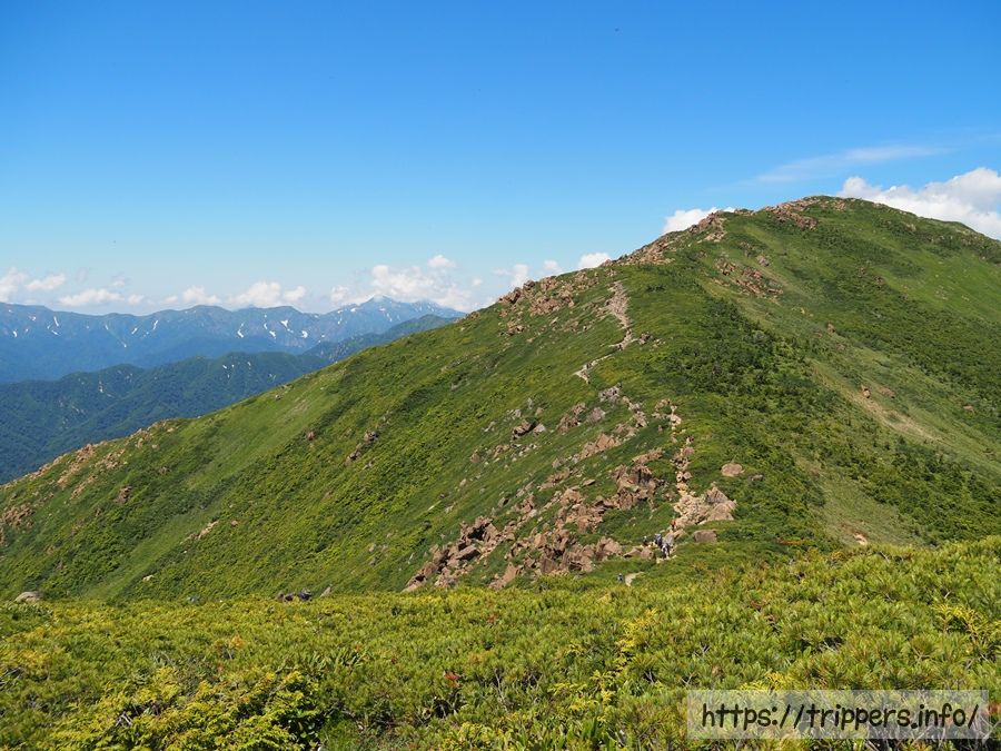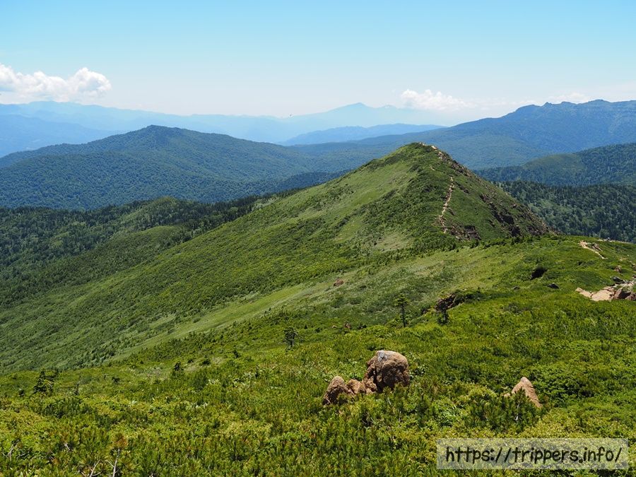 目の前に見えるピークが小至仏山です。途中で先程会話した2人のうちの1人と再会し、ショウキランの場所を教えてもらいました。そこにショウキランを観に行くことはありませんでしたが、私は今回の登山で見つけることができたのでしょうか。