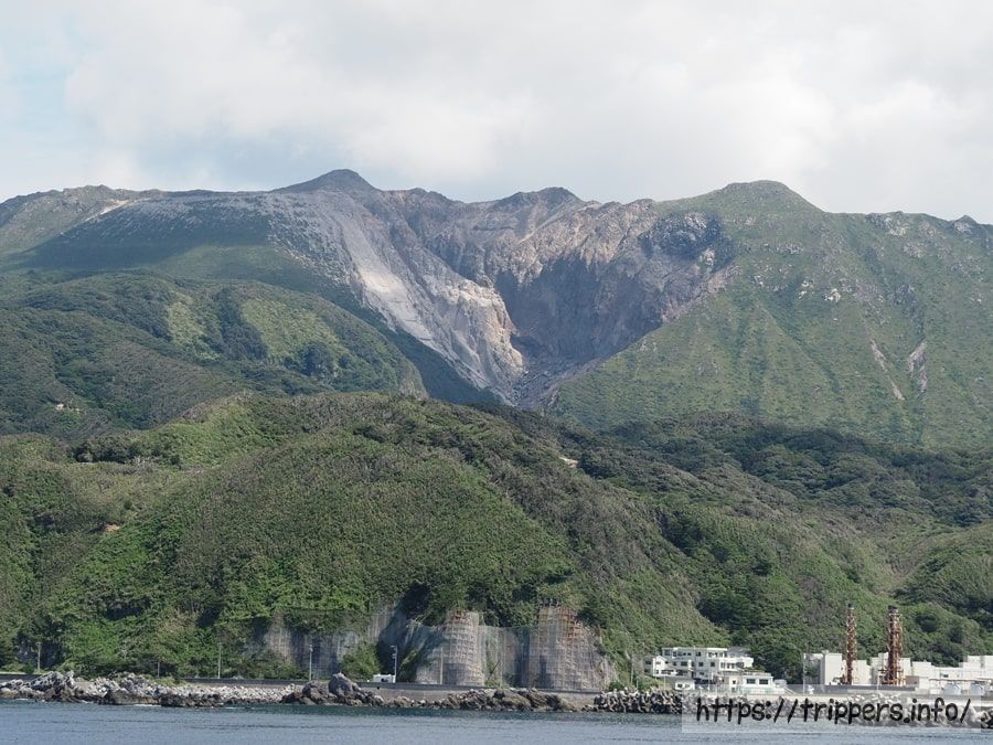 火山活動の形跡が船から見えます。ジェット船だと座席の窓越しからしか、眺められなかったので、行きはフェリーにして正解でした。