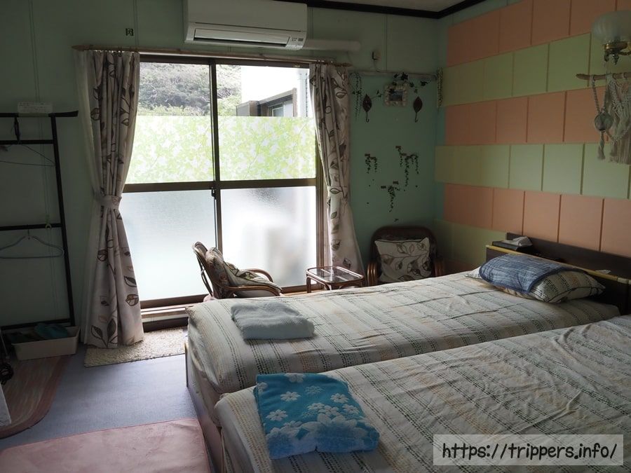 前浜港に船が接岸して下船したら、目の前で宿の車が待っていたので、乗り込んで宿へ向かいます。宿は満室でも、下田港からの宿泊者は他にいないのか、同乗者は他にいませんでした。