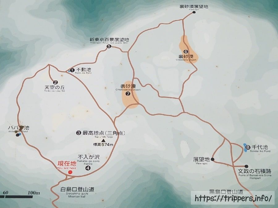 表砂漠を通過します。東京都には、砂漠が存在するなんて言われても、東京都に属する伊豆諸島を知らないと、冗談かと思ってしまいます。5月から6月にかけて、砂漠にオオシマツツジが咲くみたいで、一度は観てみたい景色です。