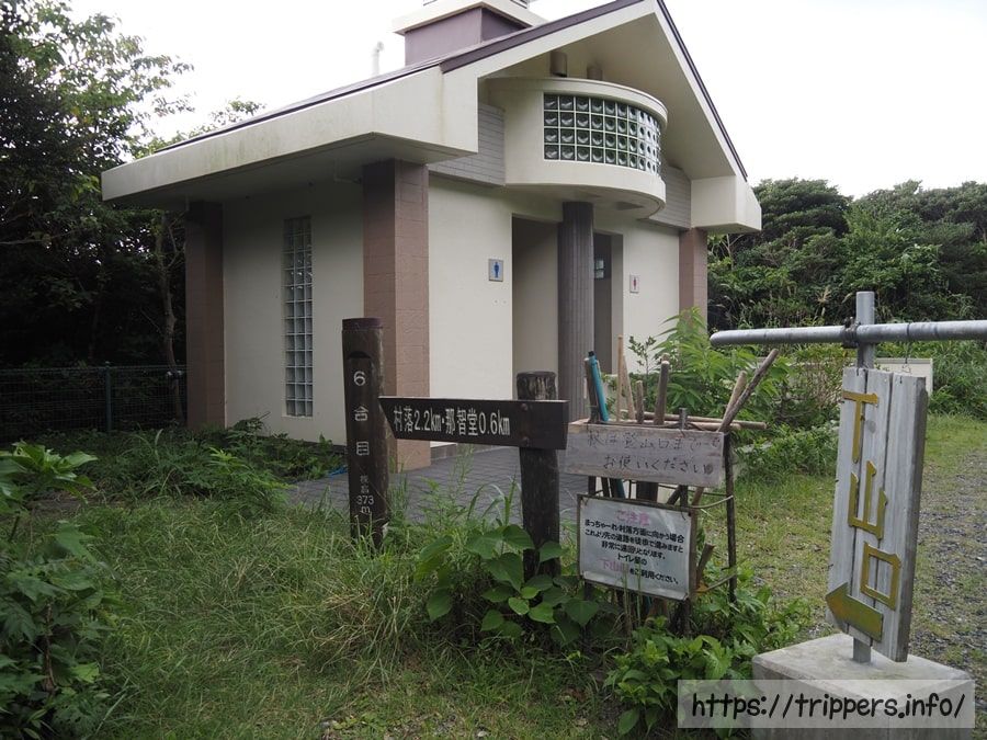 白島登山口から山頂を目指す場合、傾斜が緩いため、急勾配の黒島登山口ルートよりも楽でした。山で唯一あるトイレまで来ると6合目です。そこにはバスの本数は少ないけれど、バス停もありました。