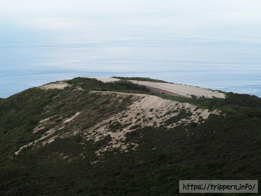 標高500mもない場所で、森林限界を抜けたような、展望の良い登山道が待っています。前浜港と遠くに恩馳島が見えています。「おんばせじま」と読みますが、最初読めませんでした。