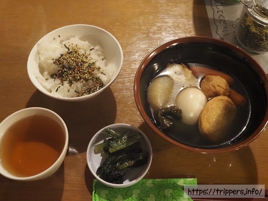 以前は魚、卵焼き、豆、オクラなど、山小屋でよくある朝食が提供されていたのですが、おでんに変わっていました。
