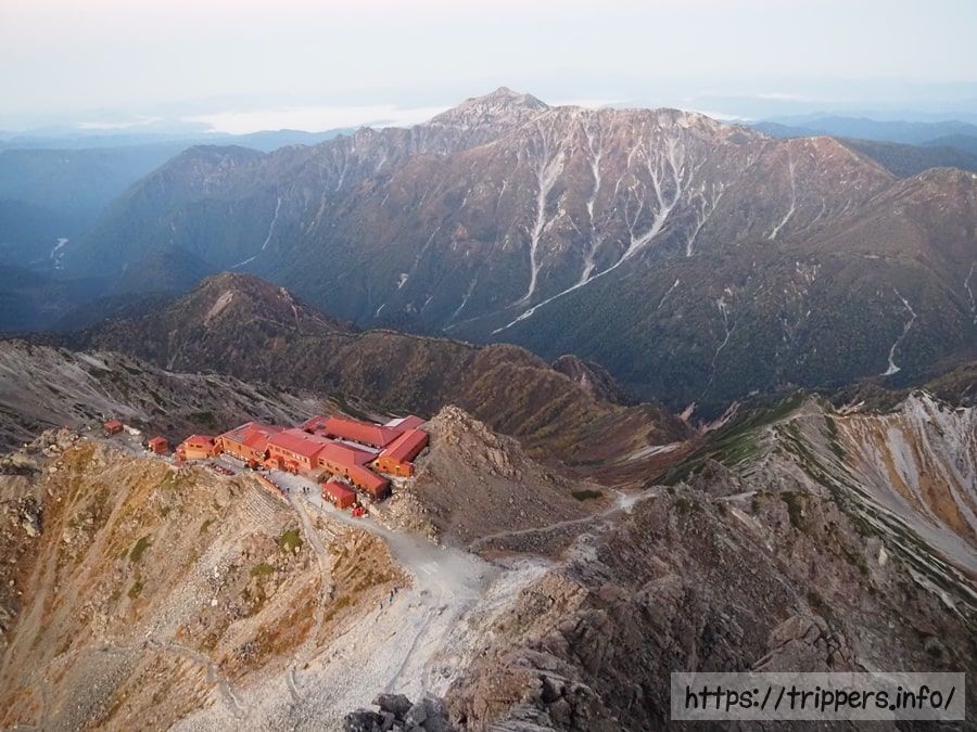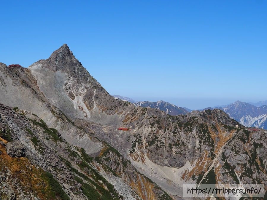 これから歩いていく縦走路です。今回は単独登山ですが、槍ヶ岳は2泊3日のツアーが催行しているのをネットでよく見かけます。個人で行くより、お値段は2倍以上かかるようです。それでも登山者憧れの山は行く価値があるのだと思います。