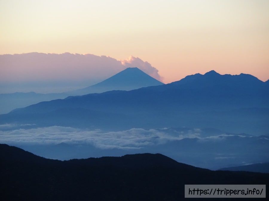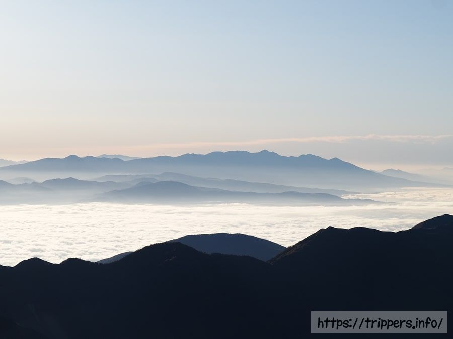 大喰岳と星空です。昨夜はガスってしまい、星は見えませんでした。夜明け前の今は穏やかで静かな時が流れています。たゆたう心あらば、幾重の思いを意思と呼ぼう。そんな言葉が浮かび上がる幾重の空でした。(不思議ちゃんが表面に顔をだしてますね。)