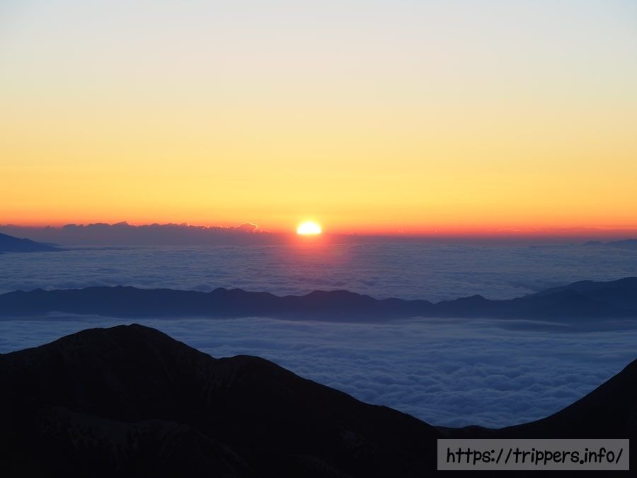 朝日が雲海から顔を出しました。神がかったような日の出に周囲からは声があがってます。