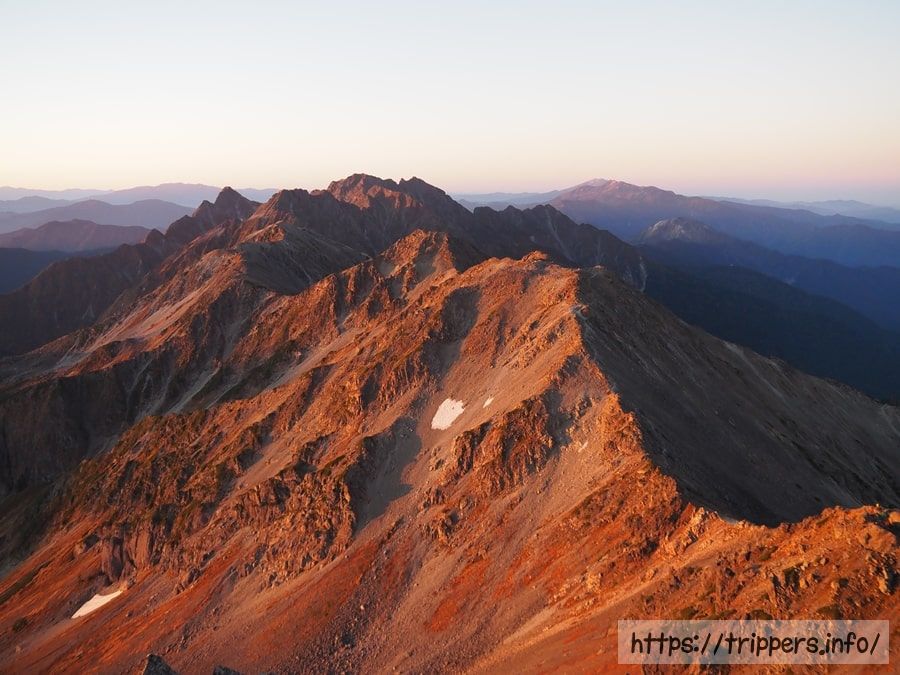 山肌が一面真っ赤に染まるのはほんの僅かな時間です。笠ヶ岳の頂上も朝日を浴びていました。山小屋の周辺でご来光を見るよりも、ずっと感動的でした。山頂だから見れた刹那の景色です。