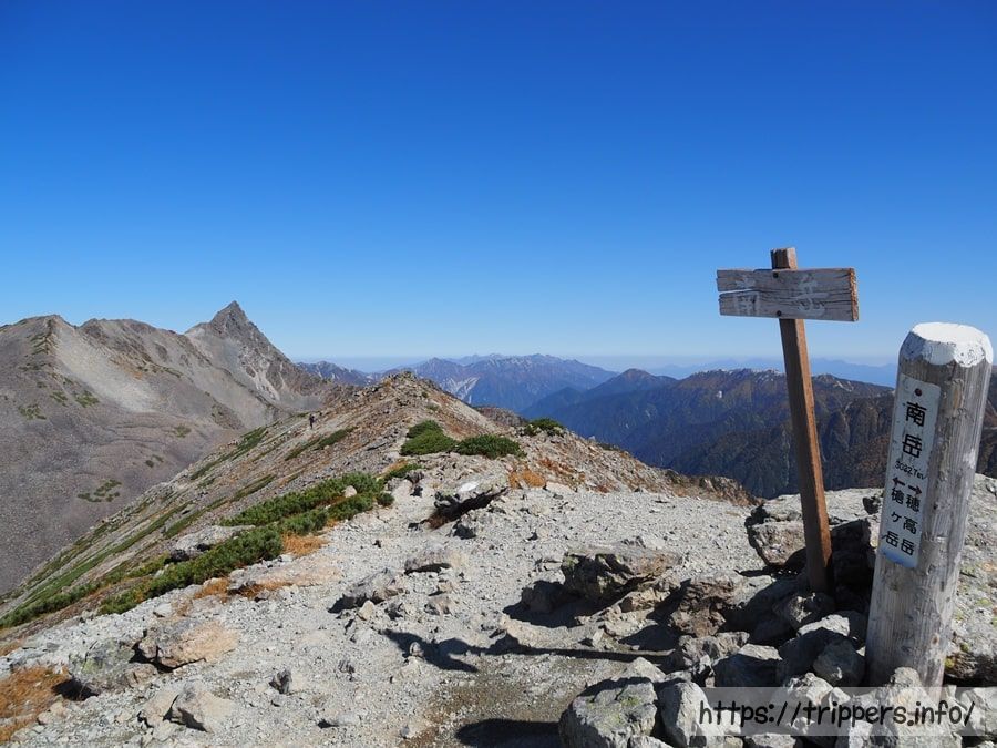 日本で17番目に高い標高3,033mの南岳の山頂に到着しました。ここでは、同じルートを歩いてきた単独の登山者に出会いました。どうやら初めてキレットに挑戦するとのことで、無事に通過できることを願いました。