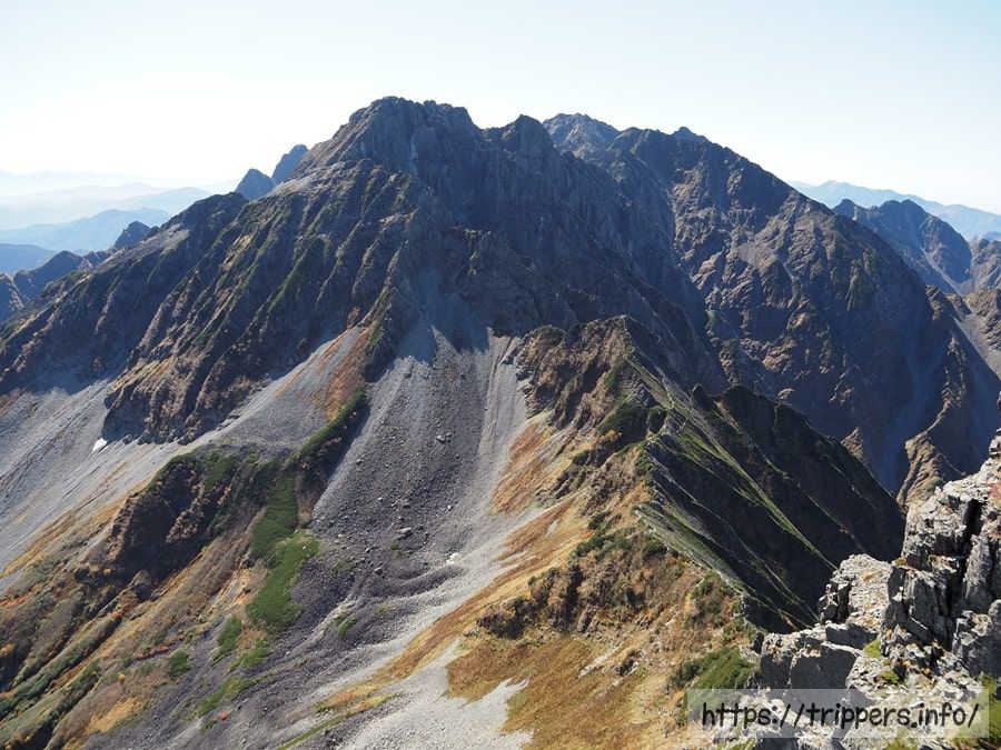 槍ヶ岳から南岳までの稜線の地形は結構穏やかでおしとやかな印象なのですが、ここだけ屈強です。蜂蜜をかけたゴマ豆腐のようです。ゴマ豆腐には、練乳か蜂蜜が美味でござります。