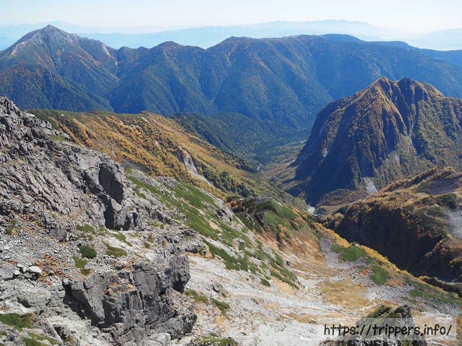 右には蝶ヶ岳があることも忘れていません。そして紅葉の絨毯も美しいです。登りコースだと目の前には常にそそり立つ壁と岩です。気分はきっとウォールマリアをよじ登る調査兵団でしょうか。進撃のライチョウはいずこにおられますか。