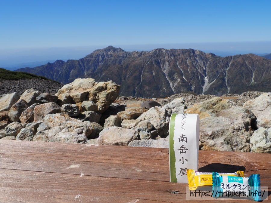 そろそろ南岳の山頂に到着します。ここら辺はライチョウを見かけやすいらしいのですが、こんなに良い天気では姿を見せてはくれなさそう。南岳小屋はスタッフがコロナ感染症にかかっており、先日まで休業してました。