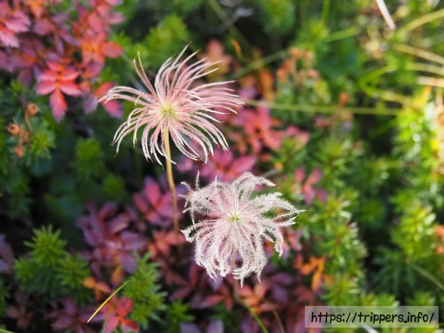 チングルマです。上のピンク色の綿毛が次第に下の個体のようになり、指で触れただけで簡単に綿毛が飛んでいってしまうようになります。繁栄の不思議です。