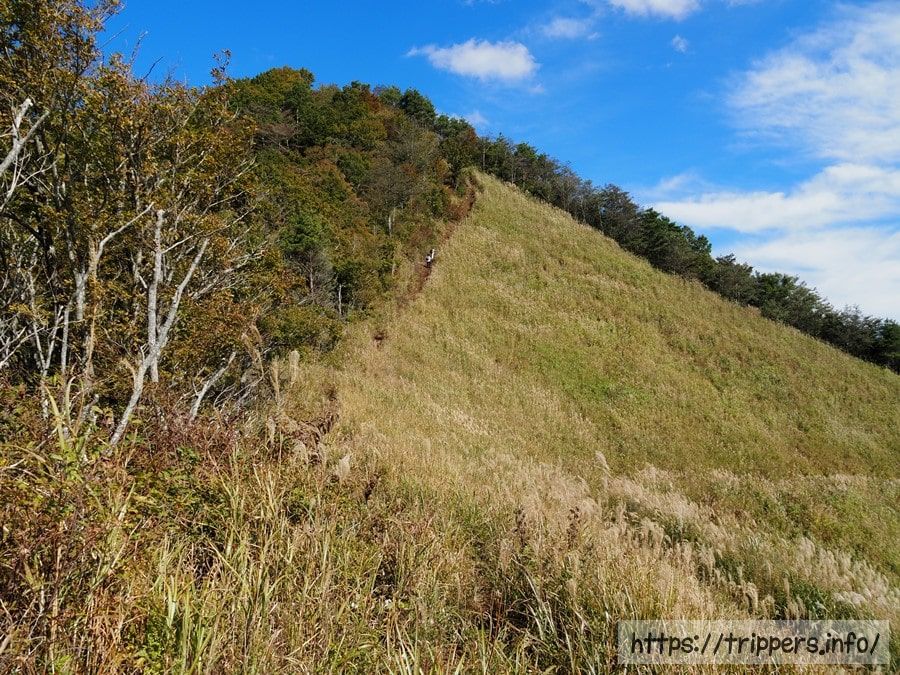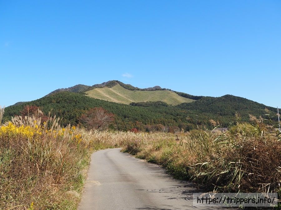 観光を終えたら、高座山の登山口である鳥居地峠まで歩いて向かいます。先程までと打って変わって、通行する人は見かけなくなりました。はげた山肌はススキが群生しており、一番標高が高いはげた場所が高座山の山頂になります。