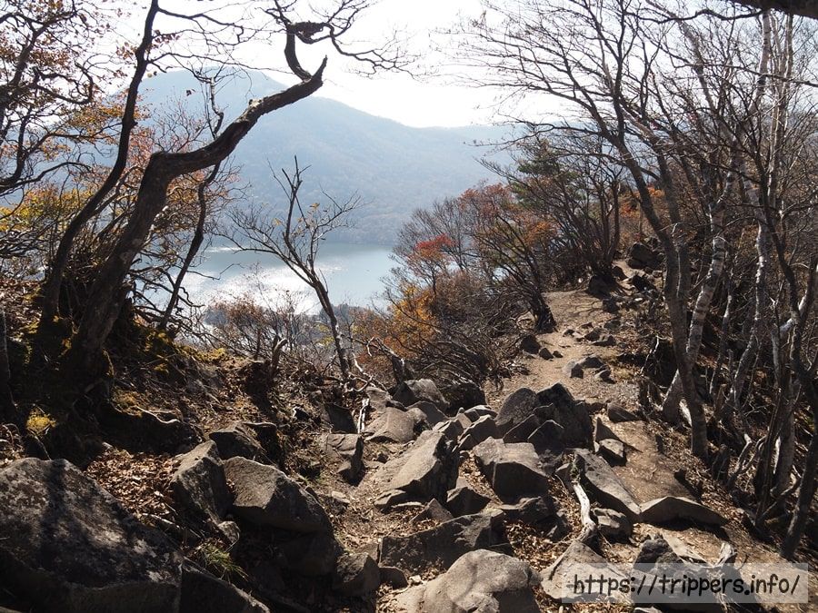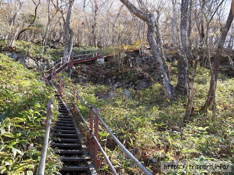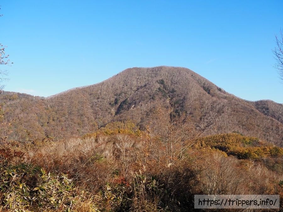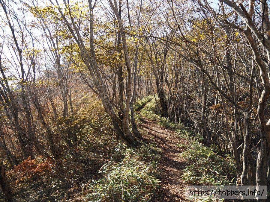 落葉した木々の中に黄葉がまだ残っていました。登山道は比較的緩やかですが、整備された丸太階段の隙間の土が流出していました。全行程を通して危険な場所はありませんでした。