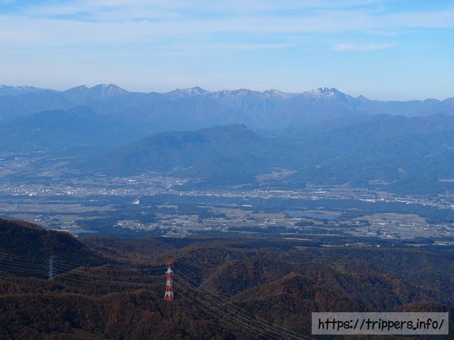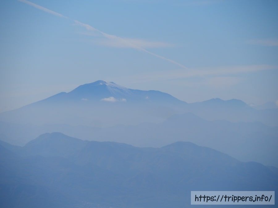浅間山はひときわ目立った山容です。その右側には空気が澄んでいると槍ヶ岳などの北アルプスが見えます。