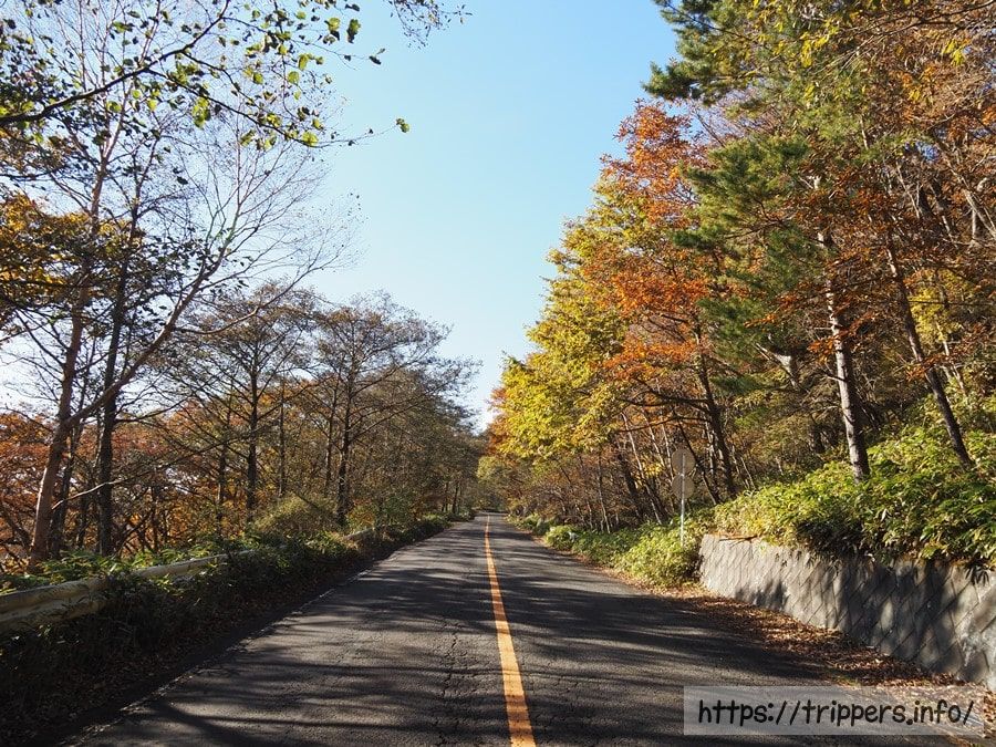 登山道を歩くのかと思ったら、五輪峠までは車道でした。緑、赤、黄色の三色のコントラストがどこまでも続きます。