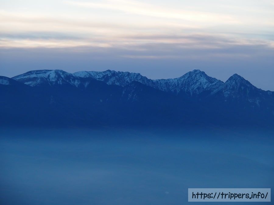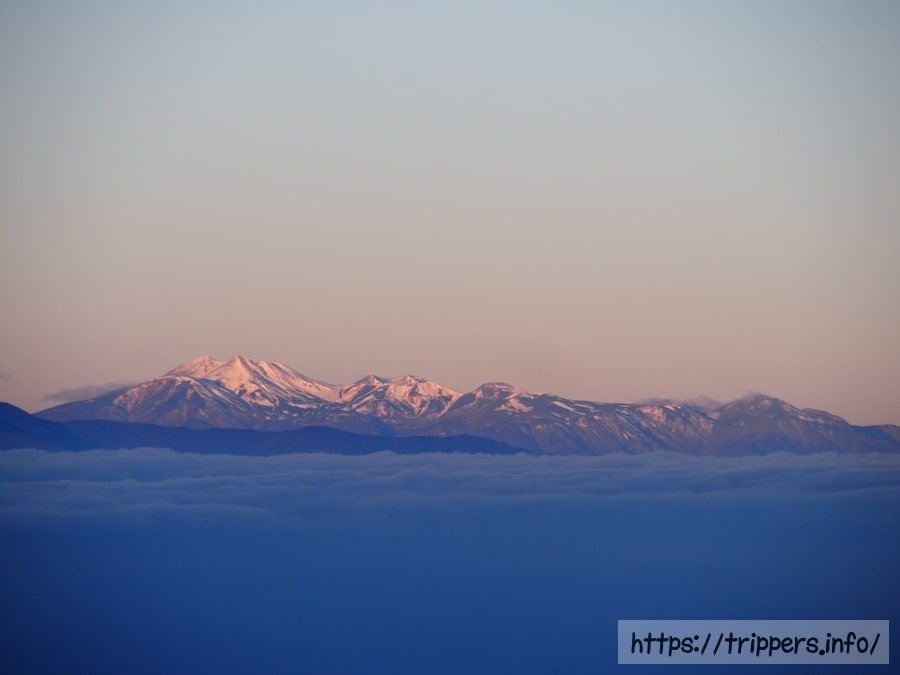 そこまで赤くないけれどモルゲンロートの景色をなんとか見れました。こちらは乗鞍岳です。車山から見れる日本百名山の数は20座以上ありますが、正確な数が気になる所です。