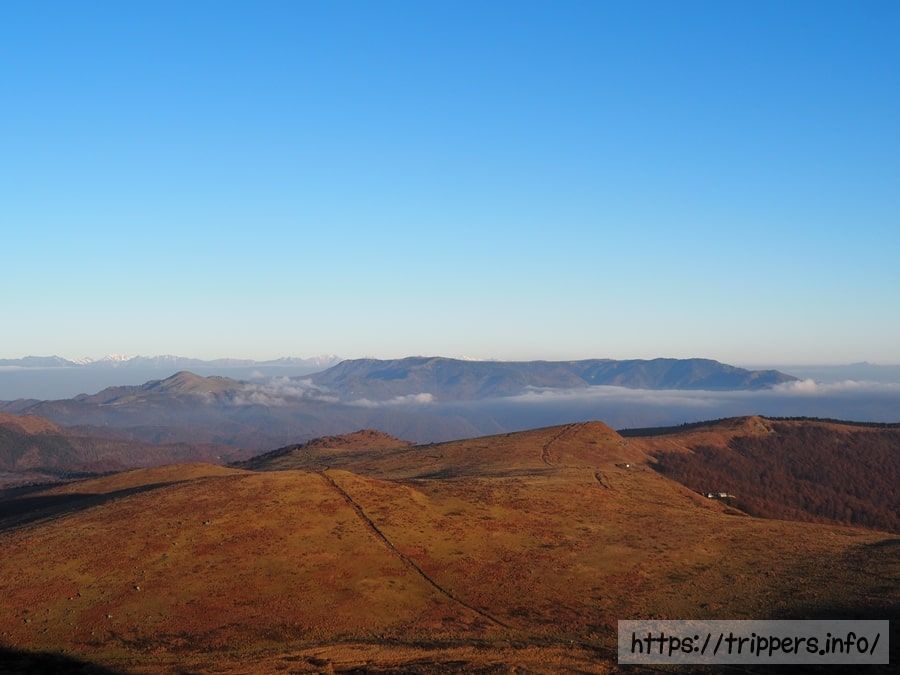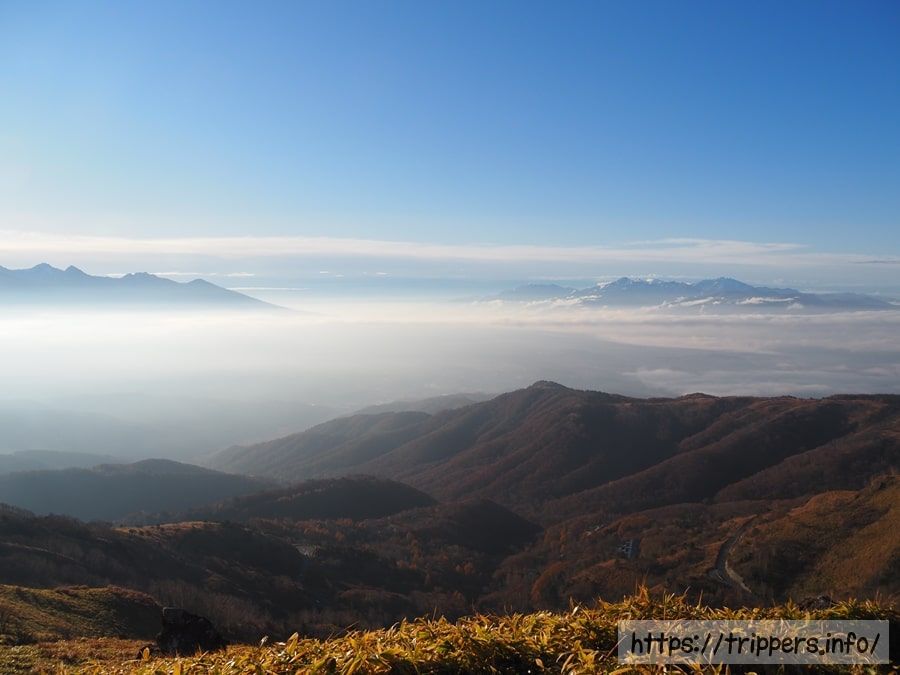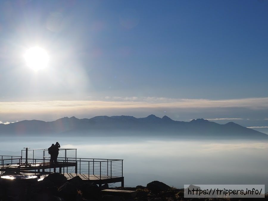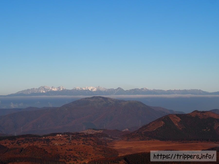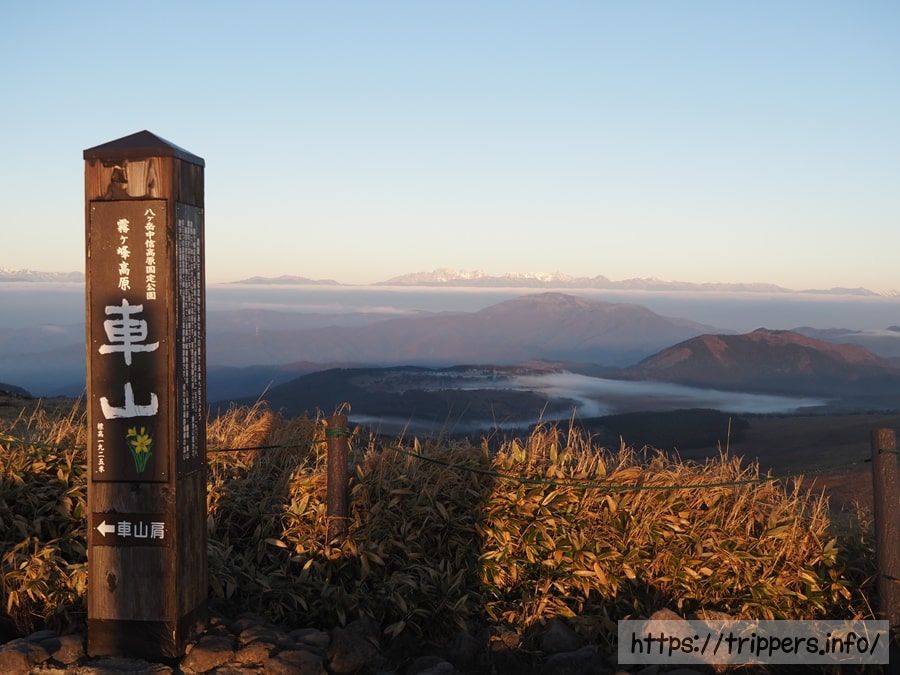 八ヶ岳から陽が昇るということは、方角的にモルゲンロートに染まった北アルプスが見られるため、車山の山頂へ急いで移動しました。鷲ヶ峰や鉢伏山の下に見える八島ヶ原湿原には霧が発生して幻想的でした。