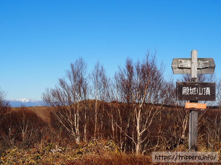 2つめの山頂、標高1,800mある殿城山に到着しました。木々の隙間から槍ヶ岳が見えますが、本当の展望は反対側にあります。