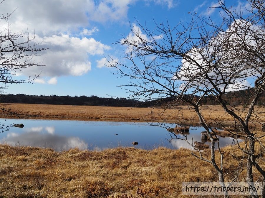 鎌ヶ池です。湿原というと、尾瀬のような無数の池塘があって、水が豊富なイメージを抱いていたのですが、雪解け水もない秋であるためか湿原ぽさには、なかなか出会えませんでした。湿原植物が見られる夏に来るのが良いのか、草紅葉と空気が澄んで展望が良い秋に来るのが良いのか、どちらがよりおすすめでしょうか。好みや目的によります。