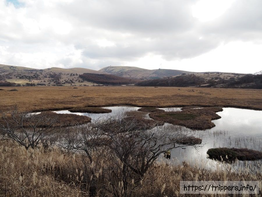 鬼ヶ泉水です。深田久弥の著書である日本百名山に車山の記述がありますが、鎌ヶ池と八島ヶ池のことは書かれていても、鬼ヶ泉水は記載されていません。ここら辺は沼が蘚苔類の生長によって湿地に変わった場所です。個人的には鎌ヶ池より全然おすすめです。池塘の中に幾つもの島があると、一気に雰囲気が出てきます。雲が広がってしまいましたが、晴天だったら池は青かったでしょう。