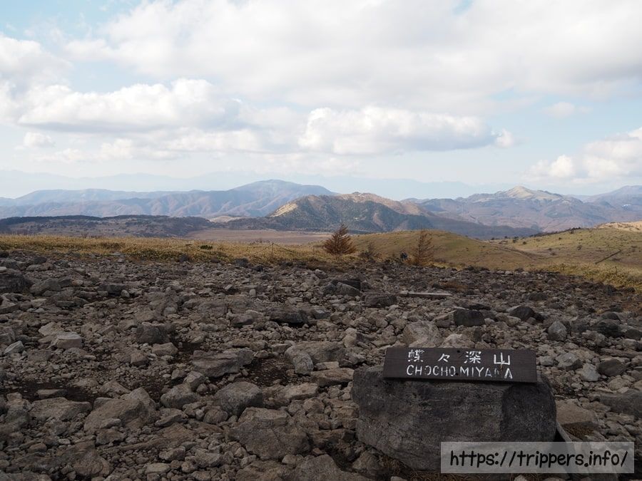 車山肩から7つめの頂上、標高1,836mある蝶々深山です。広場になっており無数の石があります。蝶々の形をした石があったことが山名の由来になっています。蝶々夫人がどうのこうのだと予想してました。
