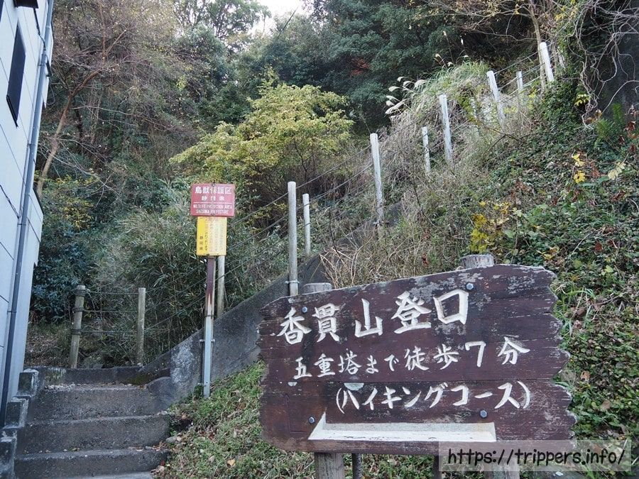 バス停からすぐの場所に香貫山登山口があります。ここから登山が始まりますが、最初はハイキングコースのようになだらかな道です。最高峰は鷲頭山の標高392mと低山であるため、楽な登山をイメージされる人も多いアルプスです。大平山まで山頂が7座ありますが、1座目の香貫山までは難易度は皆無です。