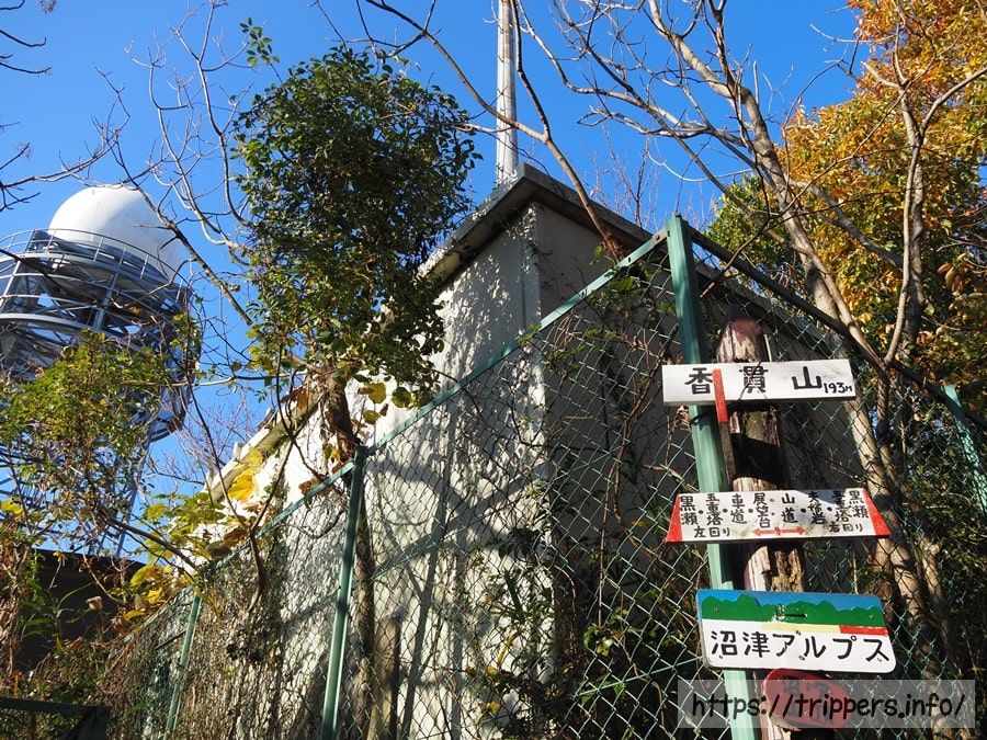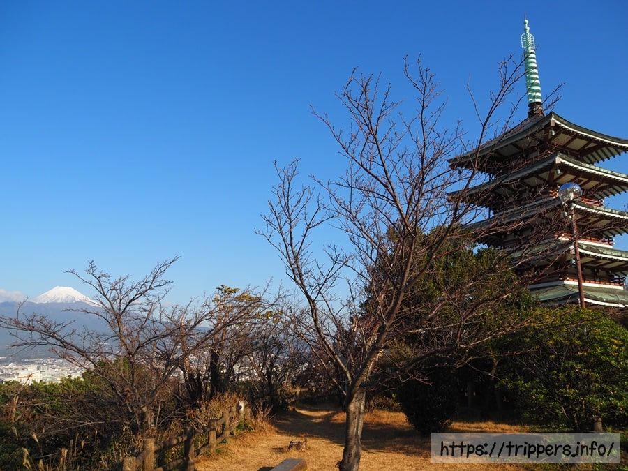 少し歩いただけで、香貫山見晴台に到着しました。富士山と駿河湾が見え、360度の展望がある高台に登りました。富士山の全容とその裾野が見えているように錯覚してしまいますが、実は手前にある愛鷹連峰によって富士山の下半身が隠れています。
