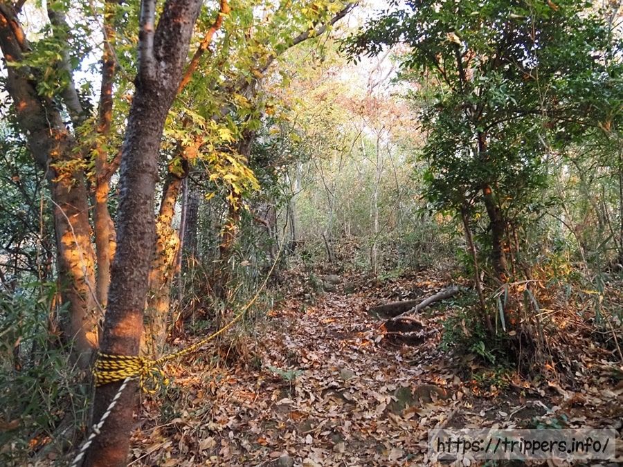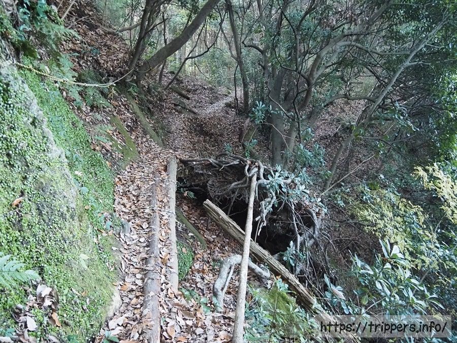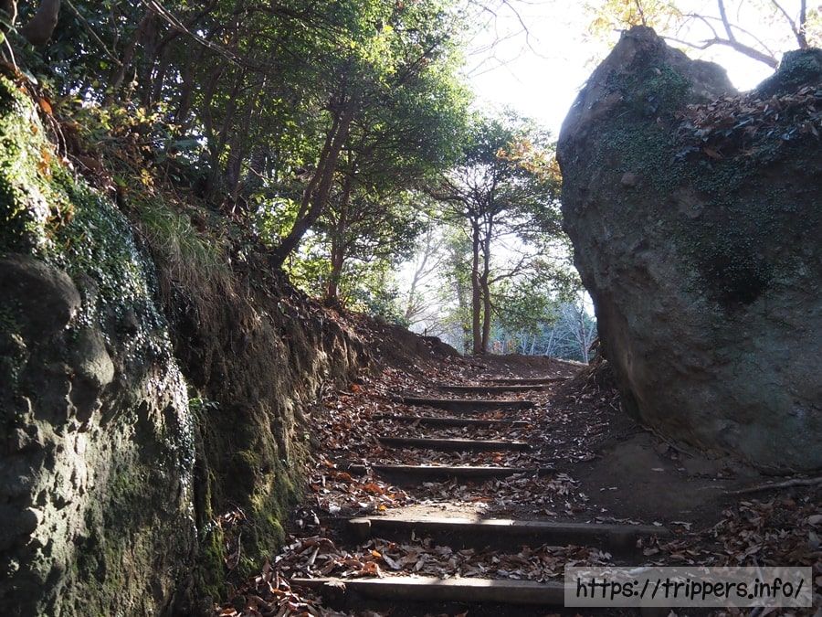 ここからが登山道として本番になります。急斜面を登っていきます。木段は一切なく、段差が大きかったり、滑りやすかったり、根っこが邪魔だったりします。それ故にロープが張ってあります。雨で地面が塗れていたり、落ち葉で滑りやすかったり、踏み外ししないように注意が必要です。