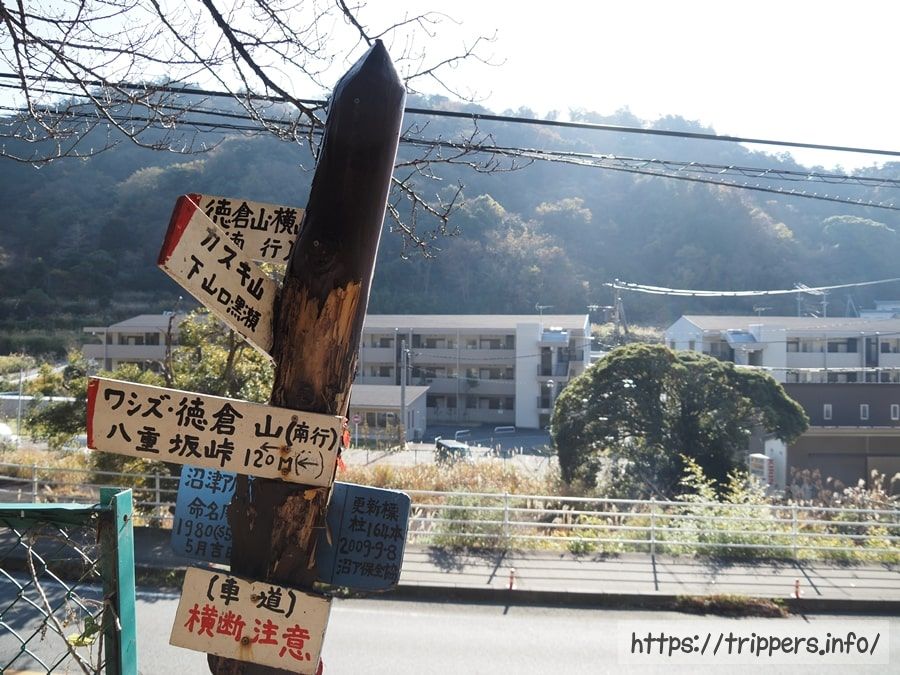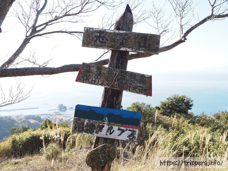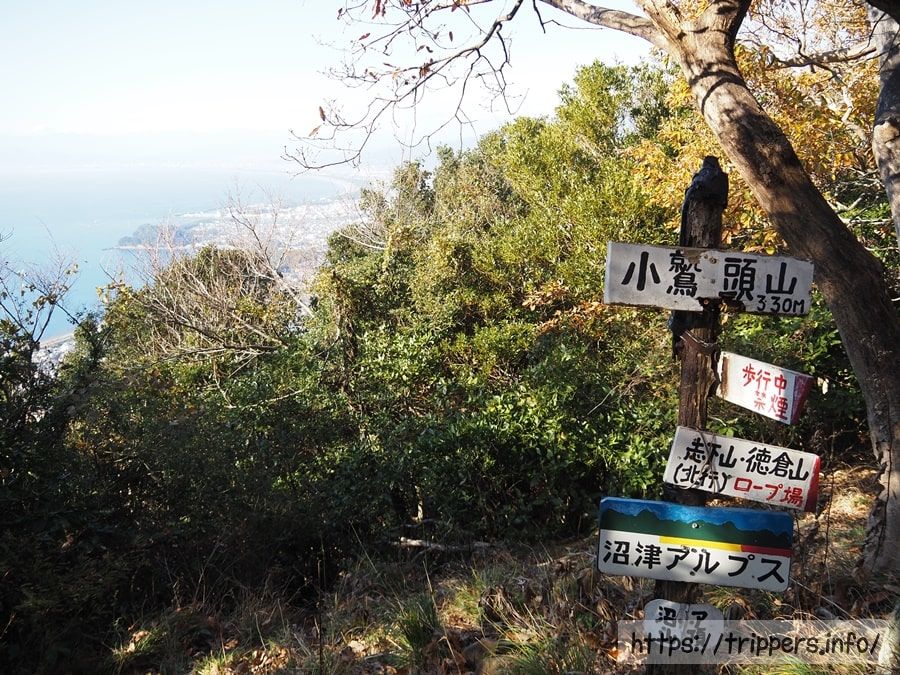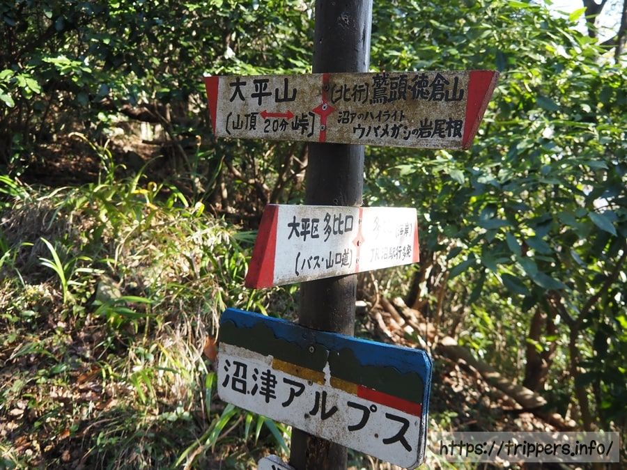 大平山の山頂手前には十字路になっており、海側と内陸側の両方へ下山できます。どちらにもバス停もあるようで、多くの登山者は多比口から登って、沼津駅へ縦走しているように思います。沼津駅から多比口へ行くバス停で行列ができていたのを今朝見かけました。