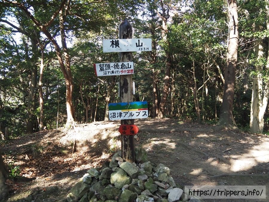 息を切らし、足の筋肉を酷使すると、ようやく標高183mの横山に到着します。これで2座目です。展望は何もありません。頑張って標高を上げたと思ったら、さっきの香貫山よりも標高が低いことに驚きます。勾配がきついアップダウンの序章です。