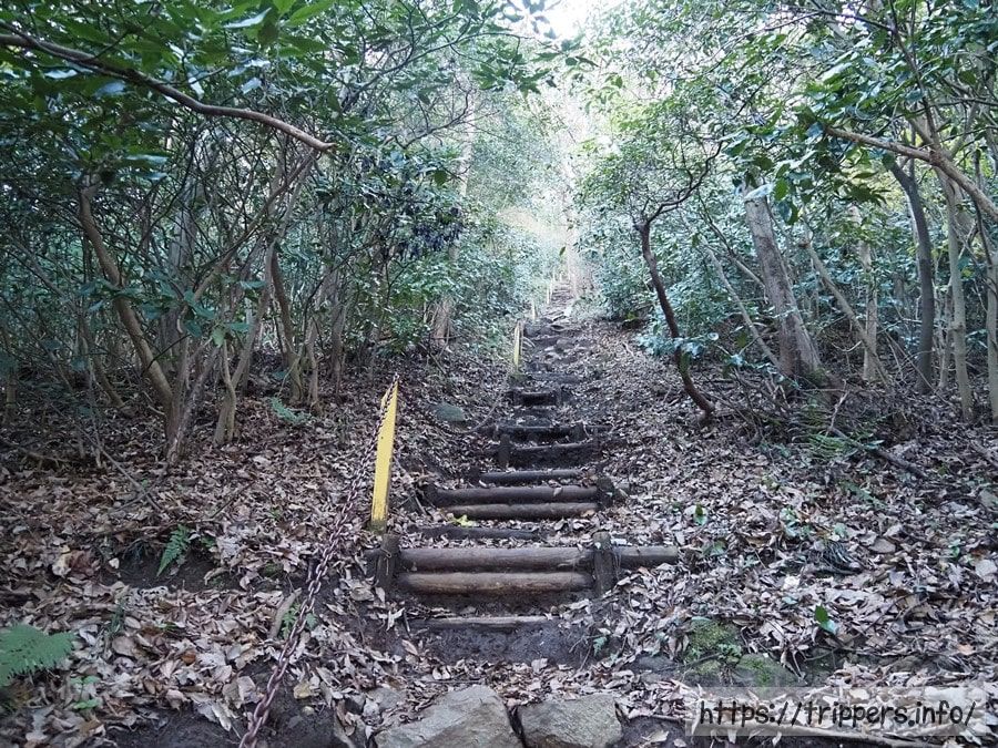 丸太で階段状に整備されてますが、丸太が縦に2本ならんでおり、段差が大きいです。未整備による荒廃を考えたら十分すぎるほどの親切設計です。このエンジェルロードを通過すれば、筋肉が増量して代謝アップによるダイエットが成功するかもしれません。今はラーメン、つけ麺、僕、太目!Alrightカモン。