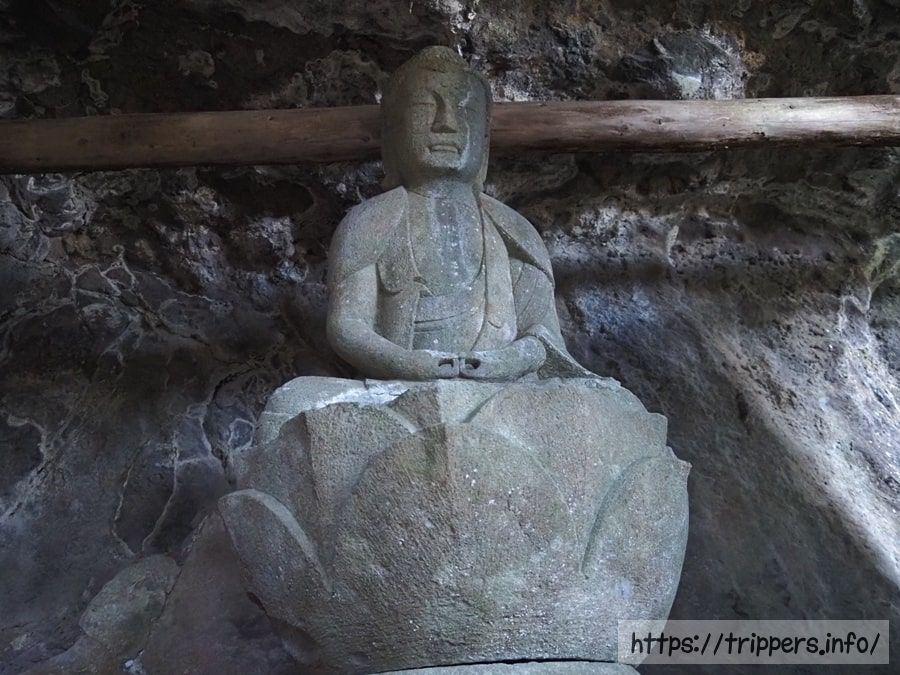 洞窟には石仏の平重衡があります。ここから小鷲頭山までは、今まで以上にきつい急登になります。ロープが張られた斜面には斑入りのアオイや斑なしのアオイが自生していました。片側は崖なので、通行には油断が大敵です。