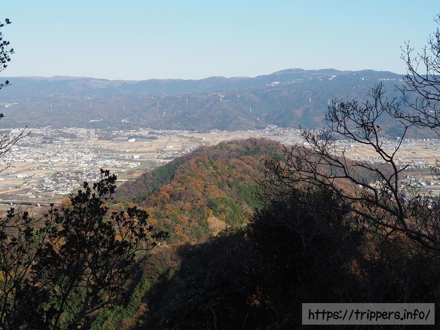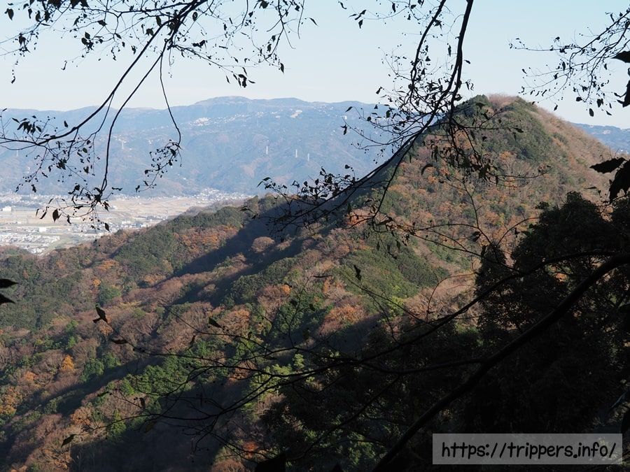 木々の隙間からは狩野川や伊豆スカイラインに沿った山の連なりが見えます。手前に見える沼津アルプスの端っこが、奥沼津アルプスのゴールかと思っていたのですが、画面に映らない更に右奥がゴールだったようで、まだまだ全行程の中盤は続きます。